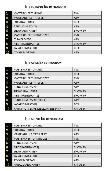 AB'de ise 1. sırada “Mastercheff Türkiye”, 2. sırada “Fox Ana Haber”, 3. sırada “Mastercheff Türkiye Özet” yer aldı.
