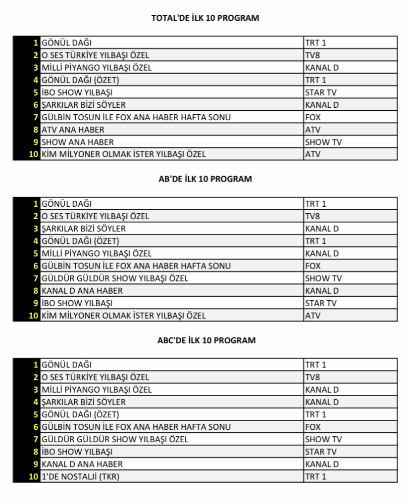 Total’de 1. sırada TRT 1’de izleyici ile buluşan “Gönül Dağı”, 2. sırada TV8’de ekranlara gelen “O Ses Türkiye Yılbaşı Özel”, 3. sırada ise Kanal D’de yayınlanan “Milli Piyango Yılbaşı Özel” programı yer aldı.