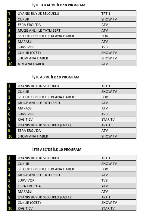 AB'de ise 1.sırada “Uyanış Büyük Selçuklu”, 2.sırada “Çukur”, 3.sırada “Selçuk Tepeli İle Fox Ana Haber” yer aldı.