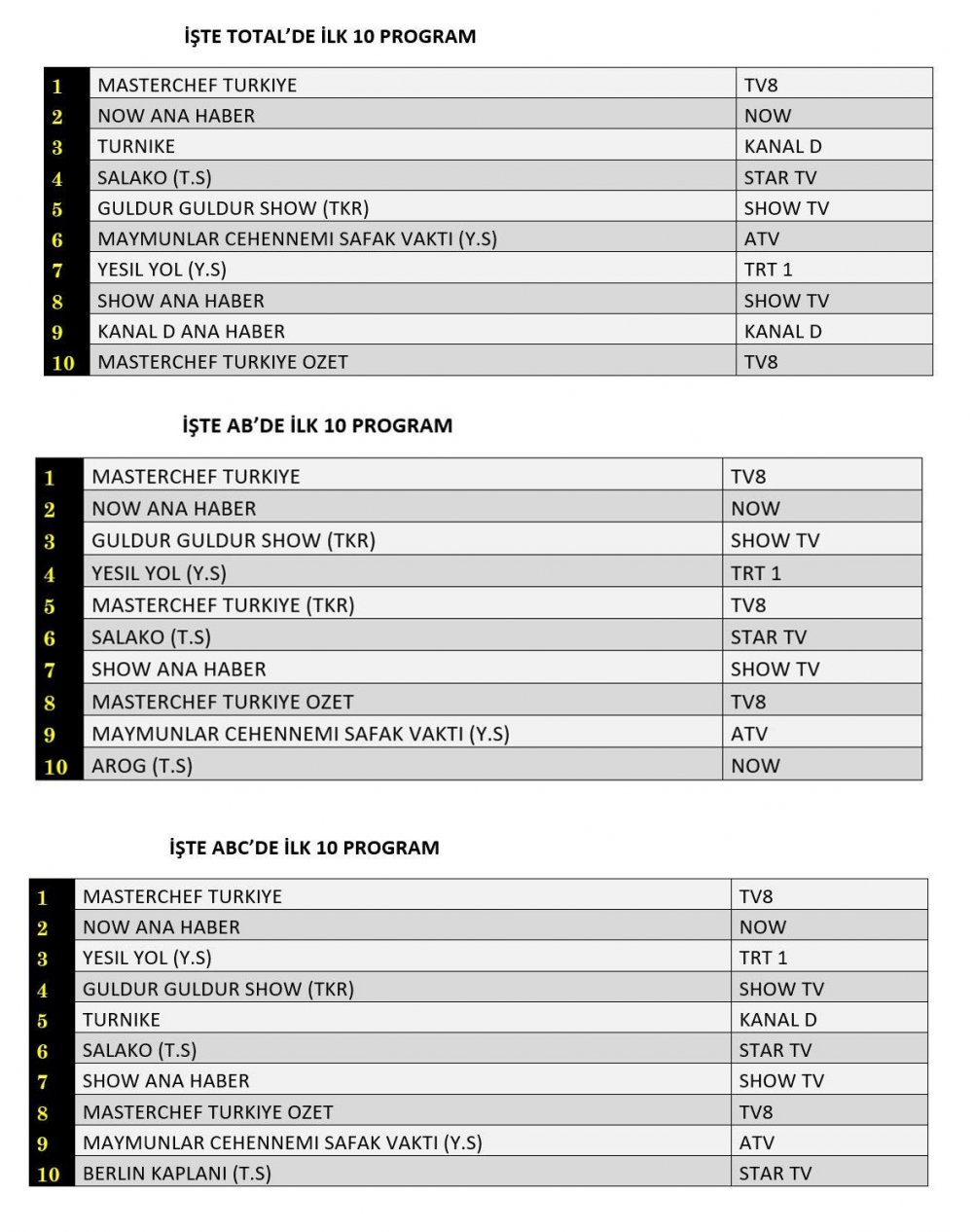 ABC'de ise 1.sırada “Masterchef Türkiye”, 2.sırada “Now Ana Haber”, 3.sırada TRT1’de ekrana gelen yabancı sinema “Yeşil Yol” yer aldı.