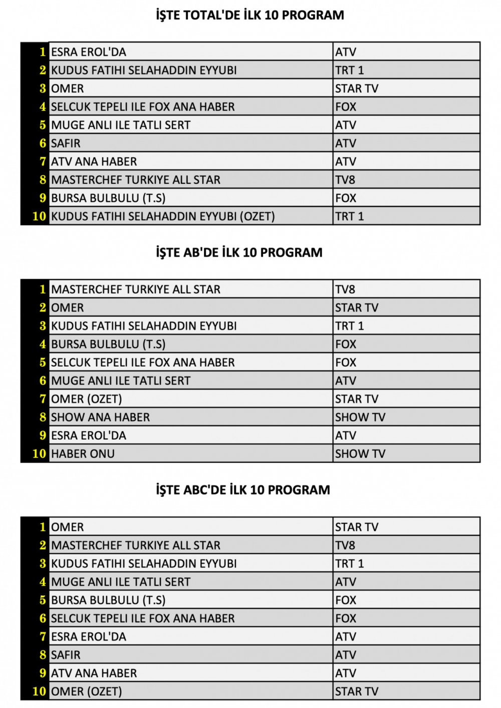 Total’de 1. sırada atv’de izleyici ile buluşan “Esra Erol'da”, 2. sırada TRT 1’de ekranlara gelen “Kudüs Fatihi Selahaddin Eyyubi”, 3. sırada ise Star TV’de yayınlanan “Ömer” yer aldı.