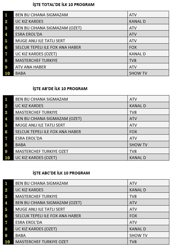 AB'de ise 1. sırada “Ben Bu Cihana Sığmazam”, 2. sırada “Üç Kız Kardeş” 3. sırada TV8’de ekrana gelen “Masterchef Türkiye” yer aldı.