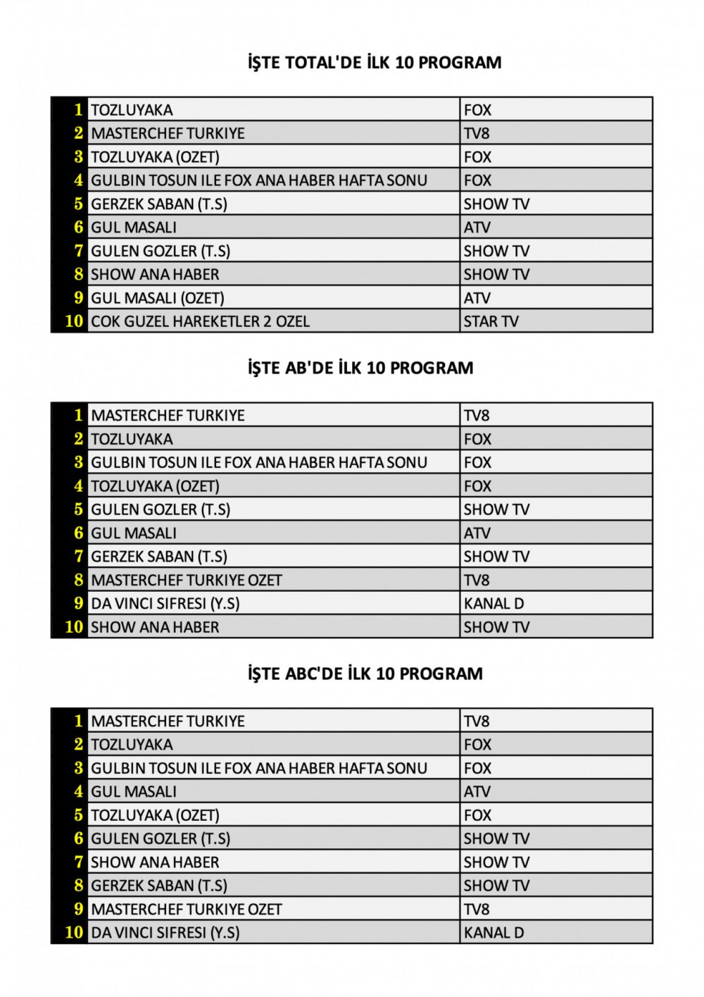 Total’de 1. sırada FOX’ta izleyici ile buluşan “Tozluyaka”, 2. sırada TV8’de ekranlara gelen “MasterChef Türkiye”, 3. sırada ise “Tozluyaka” özet bölümü yer aldı.