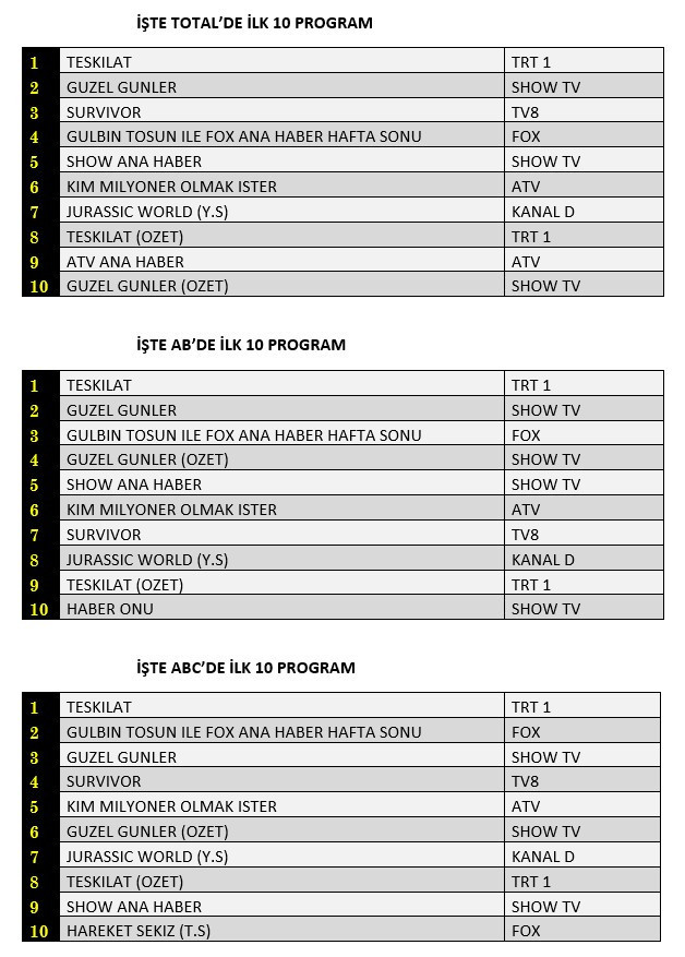 AB'de ise 1. sırada “Teşkilat”, 2. sırada “Güzel Günler”, 3. sırada “Gülbin Tosun İle Fox Ana Haber Hafta Sonu” yer aldı.