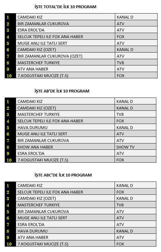Total'de 1. sırada Kanal D’de yayınlanan “Camdaki Kız” 2. sırada ATV’de izleyiciyle buluşan “Bir Zamanlar Çukurova”, 3. sırada ATV’de ekrana gelen “Esra Erol’da” yer aldı.