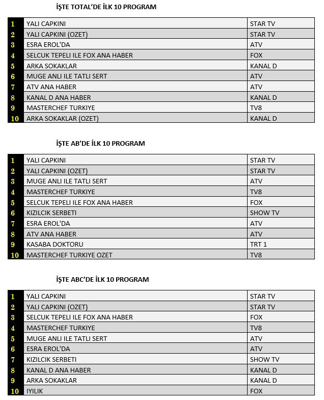 AB'de ise 1. sırada “Yalı Çapkını”, 2. sırada “Yalı Çapkını” dizisinin özeti 3. sırada Atv’de ekrana gelen “Müge Anlı İle Tatlı Sert” yer aldı.