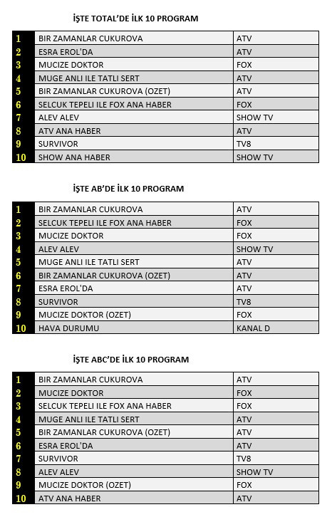AB'de ise 1. sırada “Bir Zamanlar Çukurova”, 2. sırada “Selçuk Tepeli İle Fox Ana Haber”, 3.sırada “Mucize Doktor” yer aldı.