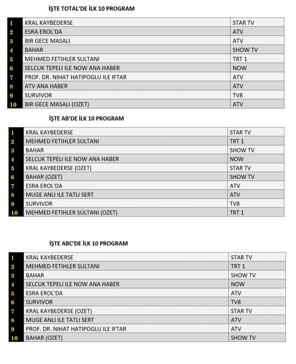 Total grubunda Star TV’nin güçlü yapımı “Kral Kaybederse” zirvede yer aldı. Gün içinde yayınlanan “Esra Erol’da” programı ise ikinci sıraya yerleşerek dikkat çekti. Atv’nin yeni dizisi “Bir Gece Masalı” da ilk üçte kendine yer buldu.