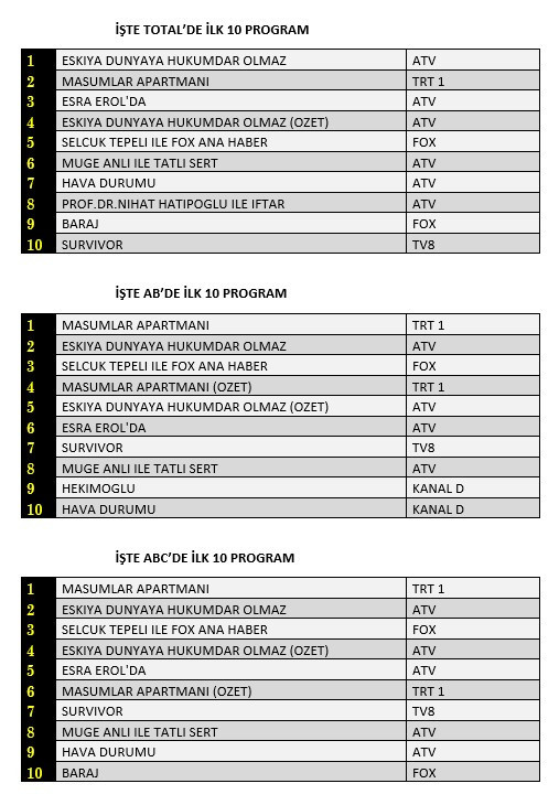 AB'de ise 1.sırada “Masumlar Apartmanı”, 2. sırada “Eşkıya Dünyaya Hükümdar Olmaz”, 3.sırada “Selçuk Tepeli İle Fox Ana Haber” yer aldı.