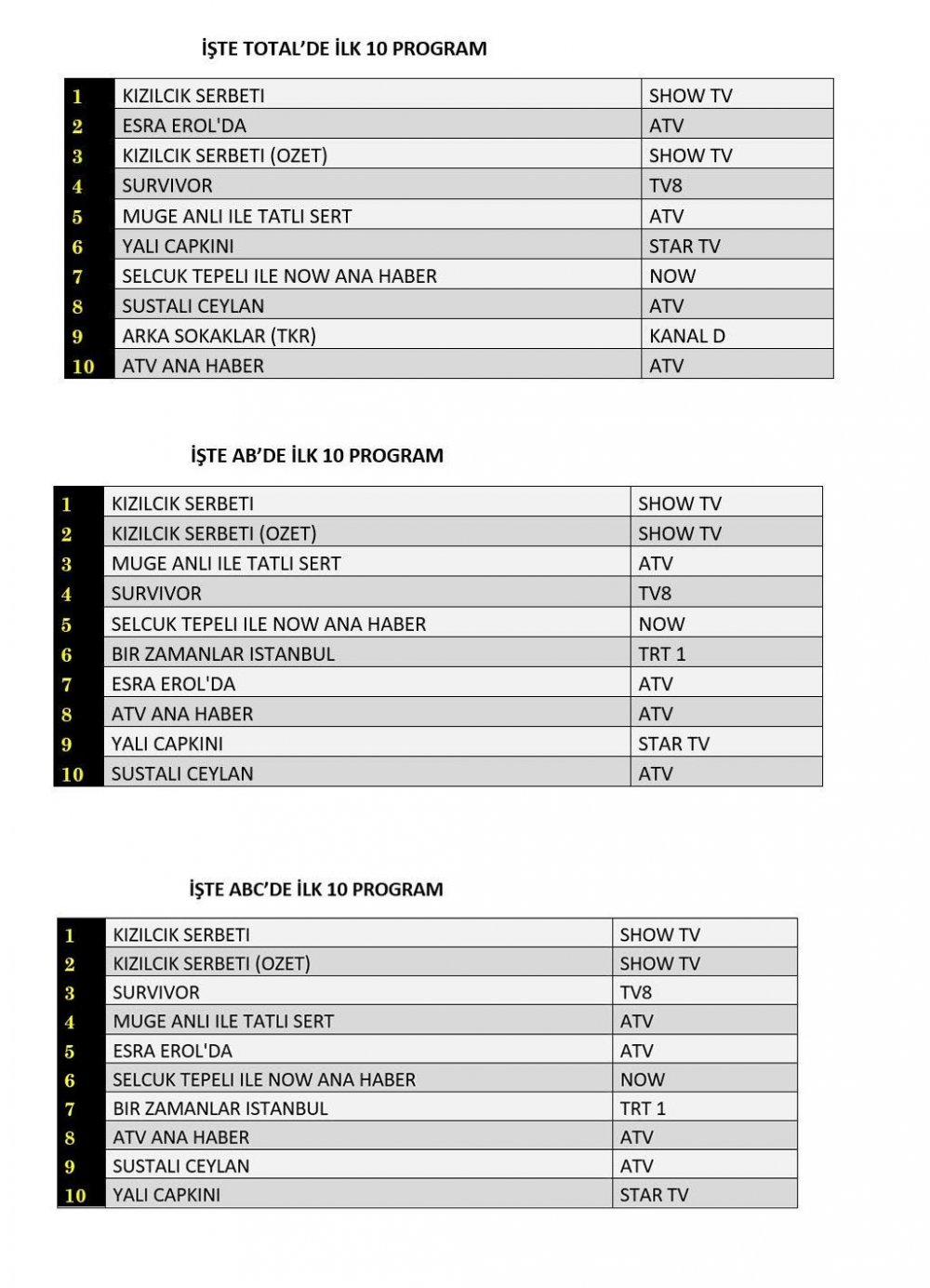 Total grubunda Kızılcık Şerbeti zirveyi kimseye bırakmadı. Gündüz kuşağının güçlü ismi Esra Erol’da ise ikinci sırada yer aldı. Dizinin özeti dahi ilk 3'e girmeyi başardı.