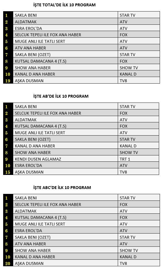 Total'de 1. sırada Star Tv’de yayınlanan “Saklı Beni”, 2. sırada Atv’de izleyiciyle buluşan “Aldatmak”, 3. sırada Atv’de ekrana gelen “Esra Erol’da” yer aldı.