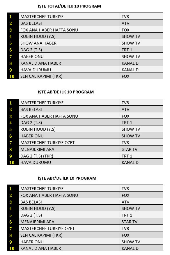 AB'de ise 1. sırada “Masterchef Türkiye”, 2. sırada “Baş Belası”, 3. sırada “Fox Ana Haber Hafta Sonu” yer aldı.