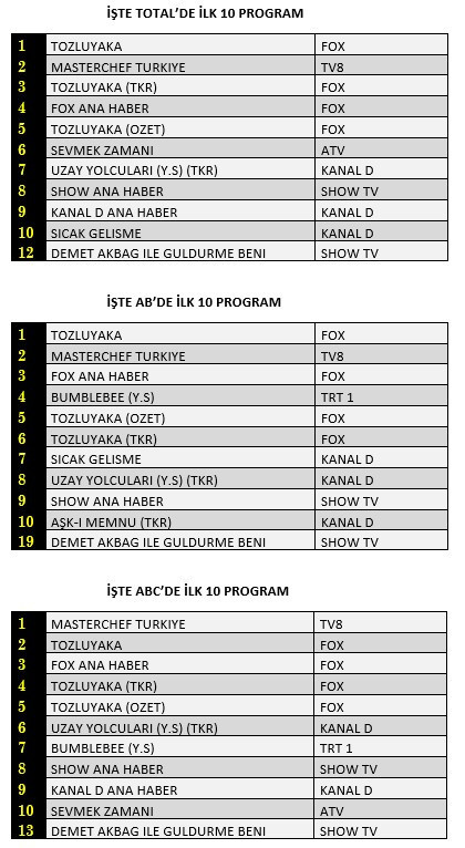 AB'de ise 1. sırada “Tozluyaka”, 2. sırada “Masterchef Türkiye” 3. sırada “Fox Ana Haber” yer aldı.