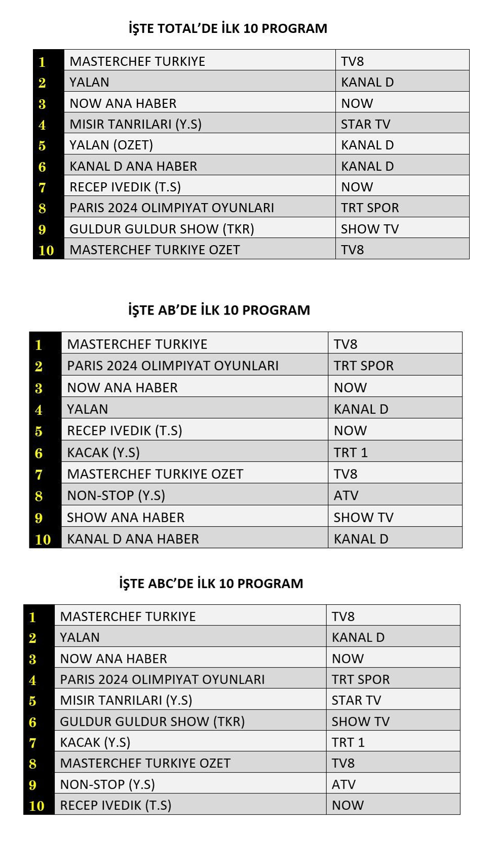 AB'de 1.sırada “Masterchef Türkiye”, 2.sırada “Paris 2024 Olimpiyat Oyunları”, 3.sırada “Now Ana Haber” yer aldı.