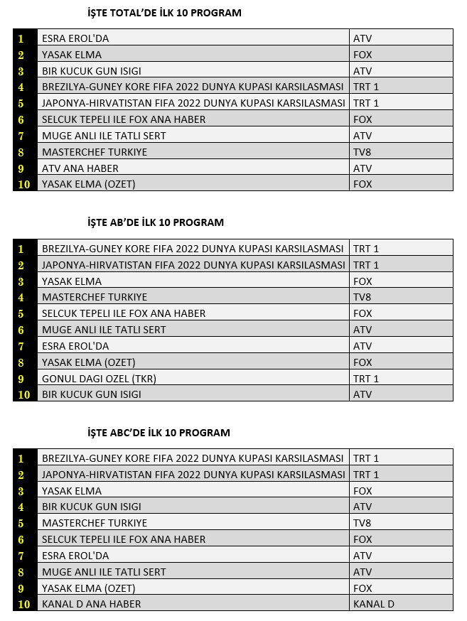 AB'de ise 1. sırada TRT1’de yayınlanan “Brezilya-Güney Kore FİFA 2022 Dünya Kupası Karşılaşması”, 2. sırada yine TRT1’de ekrana gelen “Japonya- Hırvatistan FİFA 2022 Dünya Kupası Karşılaşması”, 3. sırada “Yasak Elma” yer aldı.