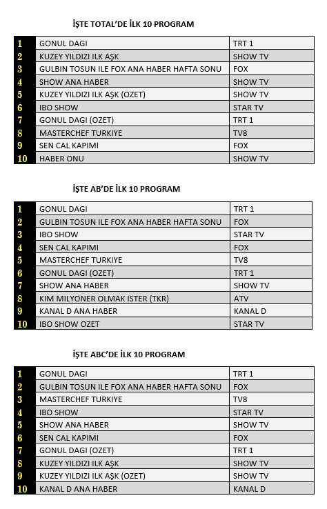 AB'de ise 1. sırada “Gönül Dağı”, 2. sırada “Gülbin Tosun İle Fox Ana Haber Hafta Sonu”, 3. sırada Star TV’de yayınlanan “İbo Show” yer aldı.