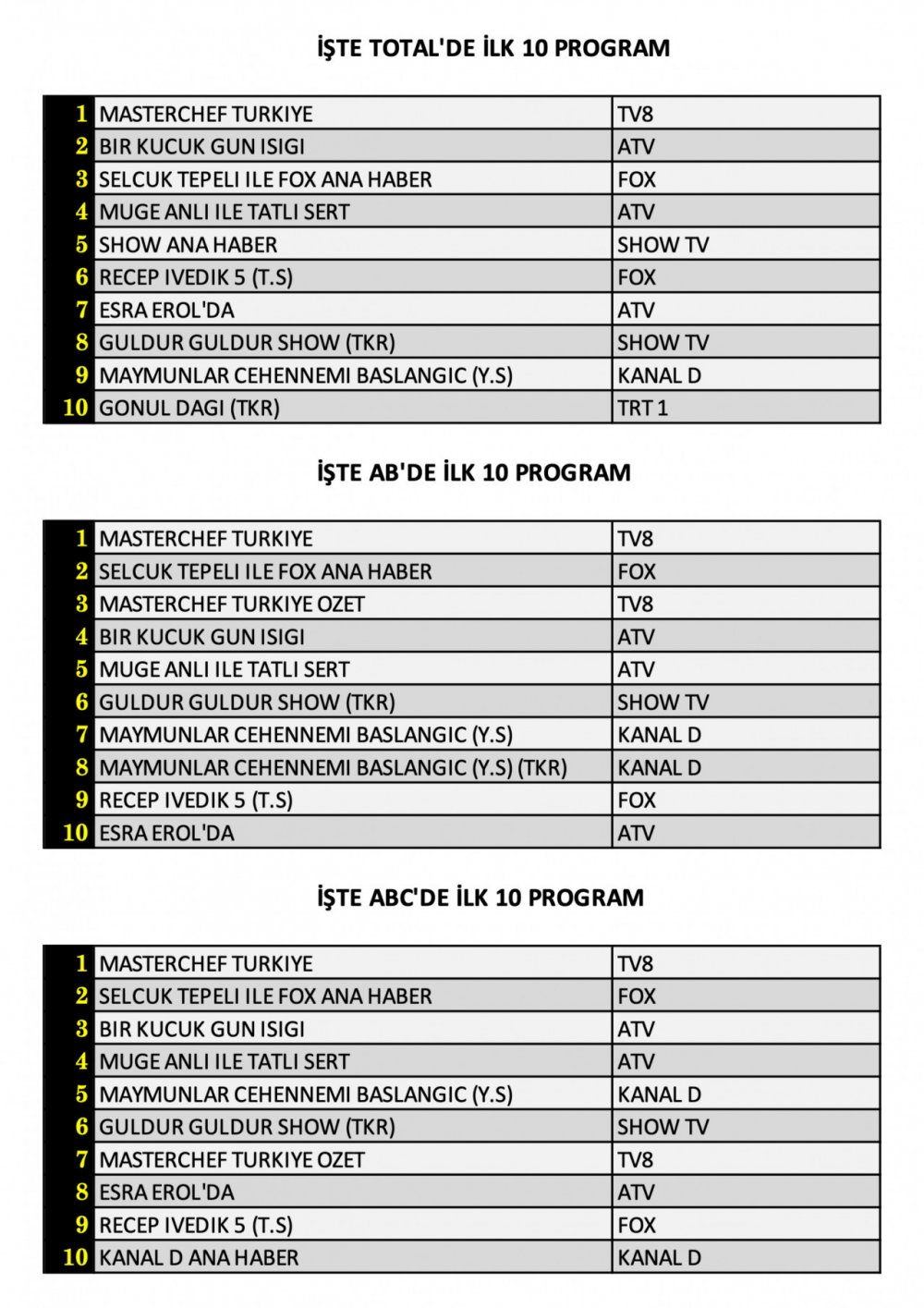 Total’de 1. sırada TV8’de izleyici ile buluşan “MasterChef Türkiye”, 2. sırada ilk bölümüyle ATV’de ekranlara gelen “Bir Küçük Gün Işığı”, 3. sırada ise “Selçuk Tepeli ile FOX Ana Haber” yer aldı.