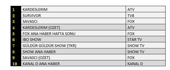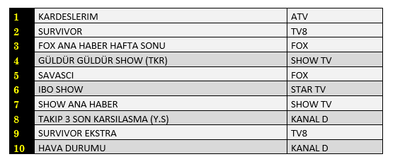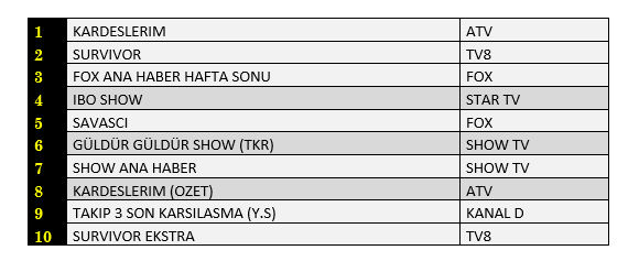 AB'de ise 1.sırada “Kardeşlerim”, 2.sırada “Survivor”, 3.sırada “Gülbin Tosun İle Fox Ana Haber Hafta Sonu” yer aldı.