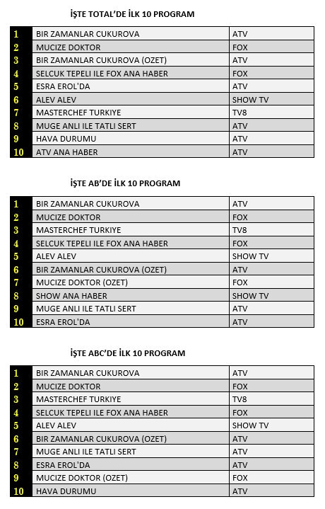 Total'de 1. sırada ATV’de yayınlanan “Bir Zamanlar Çukurova”, 2. sırada Fox TV’de ekrana gelen “Mucize Doktor”, 3. sırada “Bir Zamanlar Çukurova”nın özeti yer aldı.