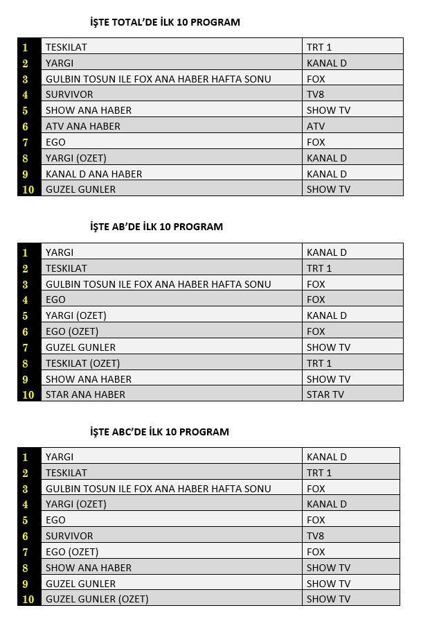 Total'de 1.sırada TRT1’de izleyiciyle buluşan “Teşkilat”, 2. sırada Kanal D’de ekrana gelen “Yargı”, 3.sırada “Gülbin Tosun İle Fox Ana Haber Hafta Sonu” yer aldı.