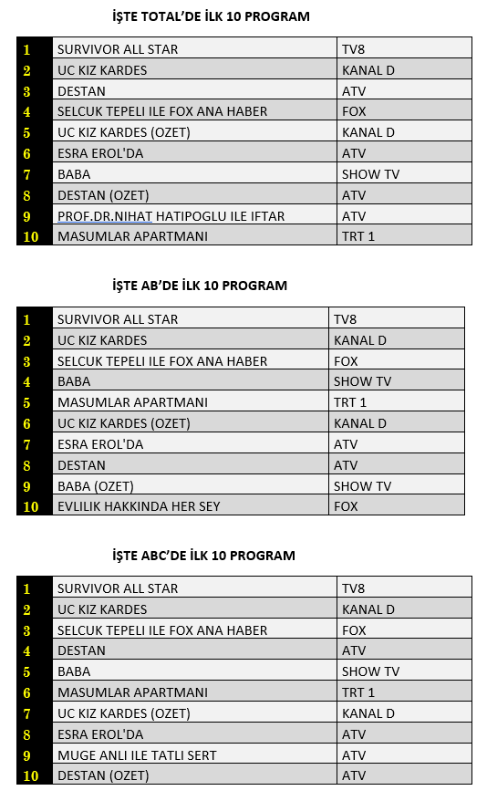 AB'de ise 1. sırada “Survivor All Star”, 2. sırada “Üç Kız Kardeş” 3. sırada “Selçuk Tepeli İle Fox Ana Haber” yer aldı.