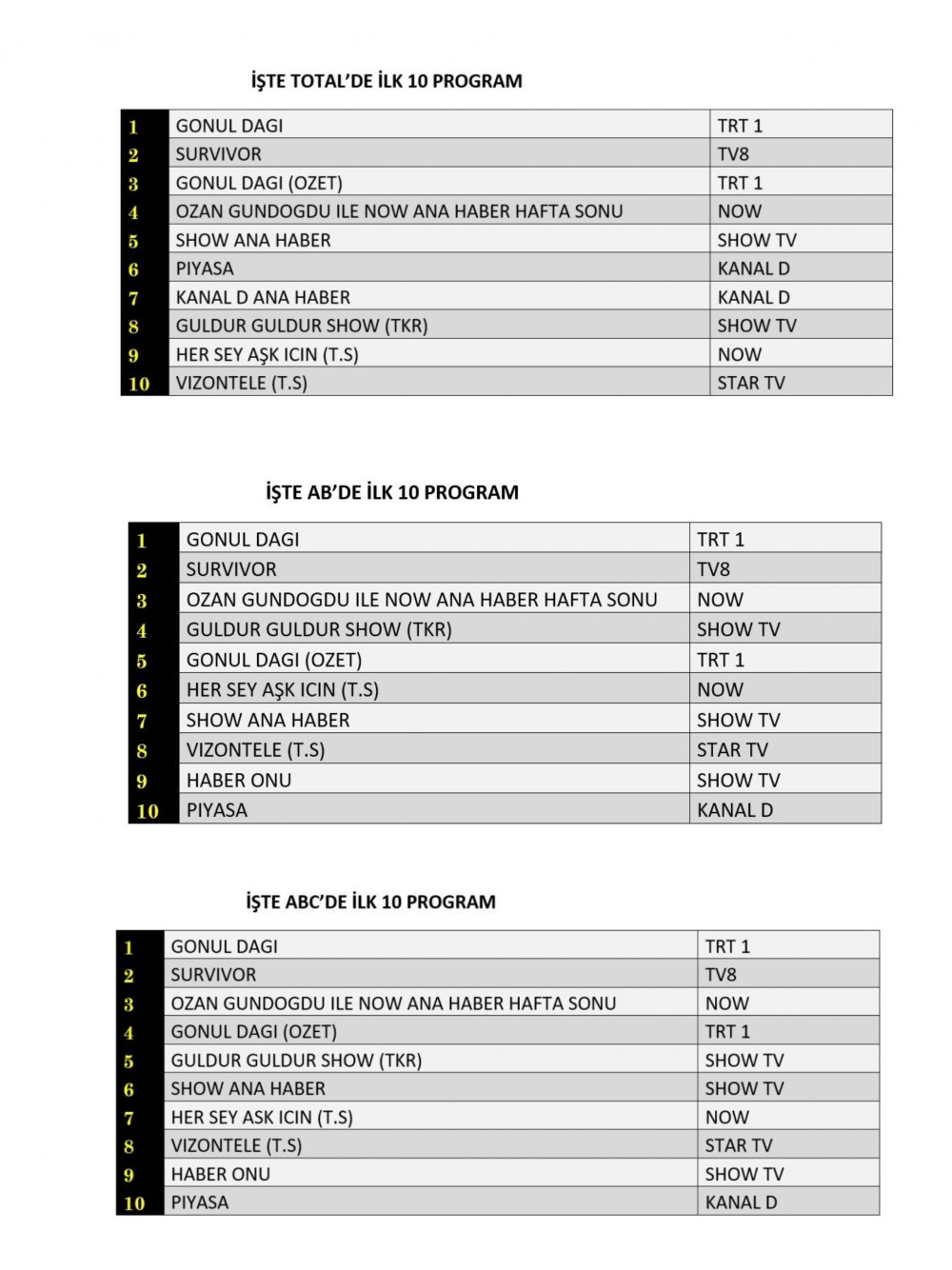 ABC1 grubunda da tablo değişmedi. Gönül Dağı üç kategoride de liderlik koltuğuna otururken, Survivor ikinciliği, Ozan Gündoğdu’nun sunduğu haber bülteni ise üçüncülüğü aldı.