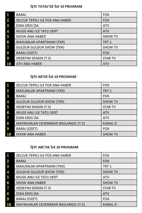 AB'de ise 1. sırada “Selçuk Tepeli İle Fox Ana Haber”, 2. sırada “Masumlar Apartmanı” dizisinin tekrarı, 3. sırada “Baraj” yer aldı.