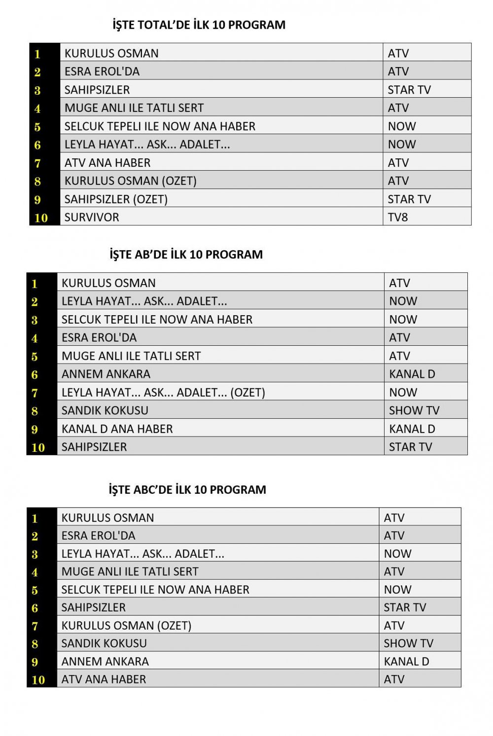 Total grubunda Atv’nin sevilen dizisi Kuruluş Osman zirvedeki yerini korudu. Esra Erol’da, gündüz kuşağındaki başarısını sürdürerek ikinci sıraya yerleşti. Sahipsizler ise Star TV ekranlarında izleyicilerle buluşarak listede kendine yer buldu.