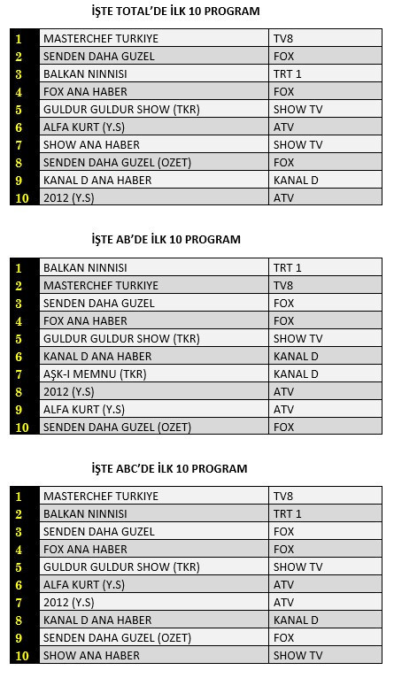 AB'de ise 1. sırada “Balkan Ninnisi”, 2. sırada “Masterchef Türkiye” 3. sırada “Senden Daha Güzel” yer aldı.