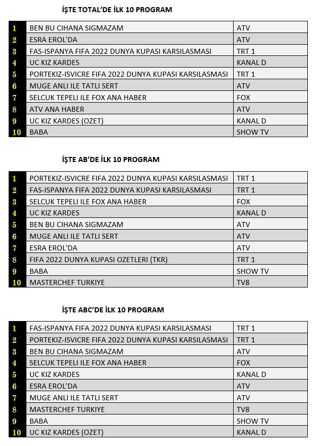 AB'de ise 1. sırada TRT1’de yayınlanan “Portekiz-İsviçre FİFA 2022 Dünya Kupası Karşılaşması”, 2. sırada yine TRT1’de ekrana gelen “Fas-İspanya FİFA 2022 Dünya Kupası Karşılaşması”, 3. sırada “Selçuk Tepeli İle Fox Ana Haber” yer aldı.