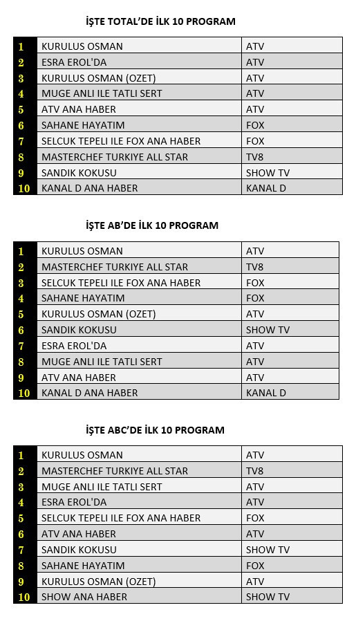 AB'de ise 1. sırada “Kuruluş Osman”, 2. sırada TV8’de ekrana gelen “Masterchef Türkiye All Star”, 3. sırada “Selçuk Tepeli İle Fox Ana Haber” yer aldı.