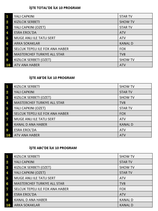 Total'de 1.sırada Star TV’de izleyiciyle buluşan “Yalı Çapkını”, 2. sırada Show TV’de yayınlanan “Kızılcık Şerbeti”, 3.sırada “Yalı Çapkını” dizisinin özeti yer aldı.