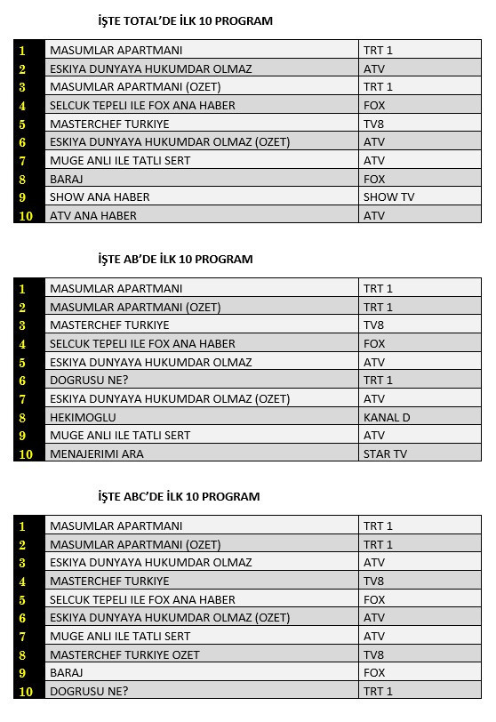 Total'de 1. sırada TRT1’de yayınlanan “Masumlar Apartmanı”, 2. sırada ATV’de ekrana gelen “Eşkıya Dünyaya Hükümdar Olmaz”, 3. sırada “Masumlar Apartmanı”nın özeti yer aldı.