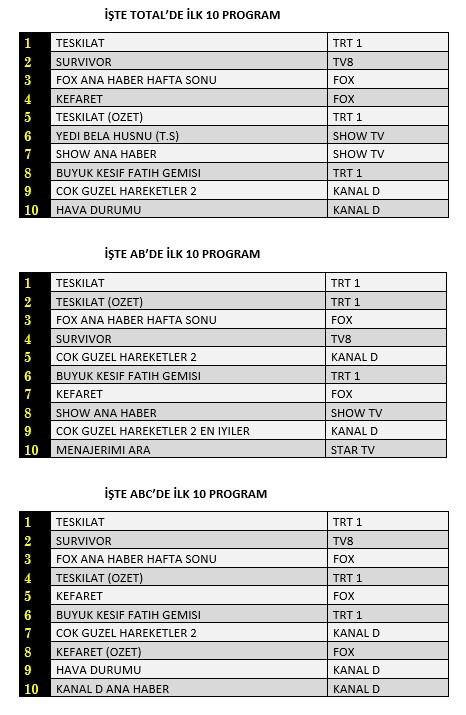 Total'de 1. sırada TRT1’de ekrana gelen “Teşkilat”, 2. sırada TV8’de yayınlanan “Survivor”, 3. sırada “Fox Ana Haber Hafta Sonu” yer aldı.