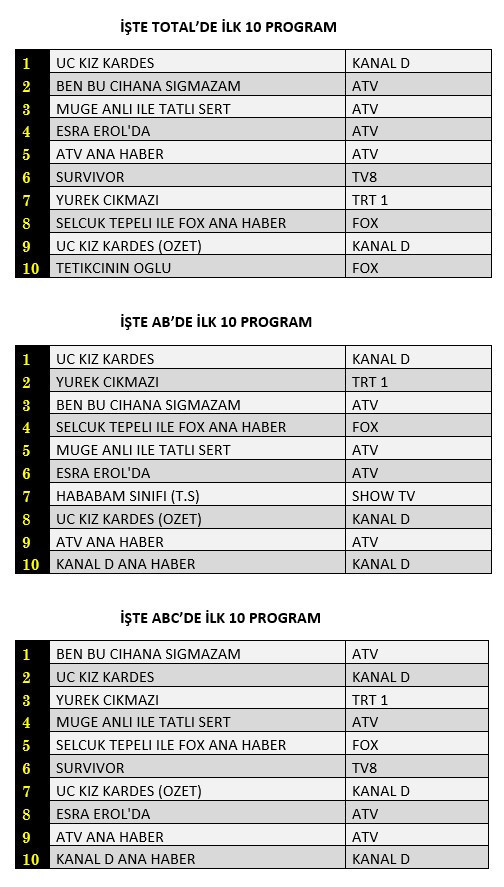 AB'de ise ilk sırayı yine "Üç Kız Kardeş" aldı, bu kez Kanal D'de. TRT1'de yayınlanan "Yürek Çıkmazı" ikinci sırayı elde ederken, "Ben Bu Cihana Sığmazam" üçüncü sırada yer aldı.