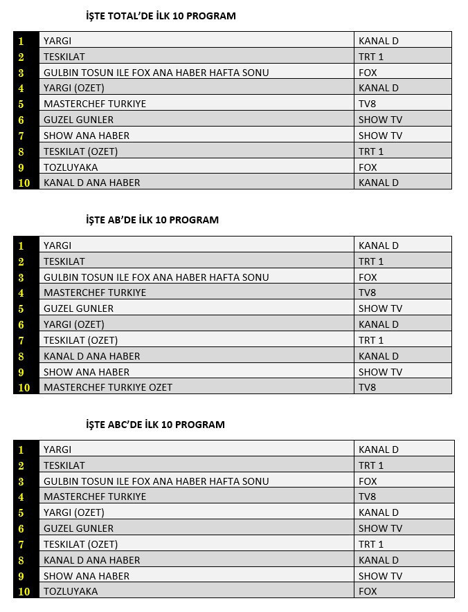 AB'de ise 1. sırada “Yargı”, 2. sırada “Teşkilat” 3. sırada “Gülbin Tosun İle Fox Ana Haber Hafta Sonu” yer aldı.