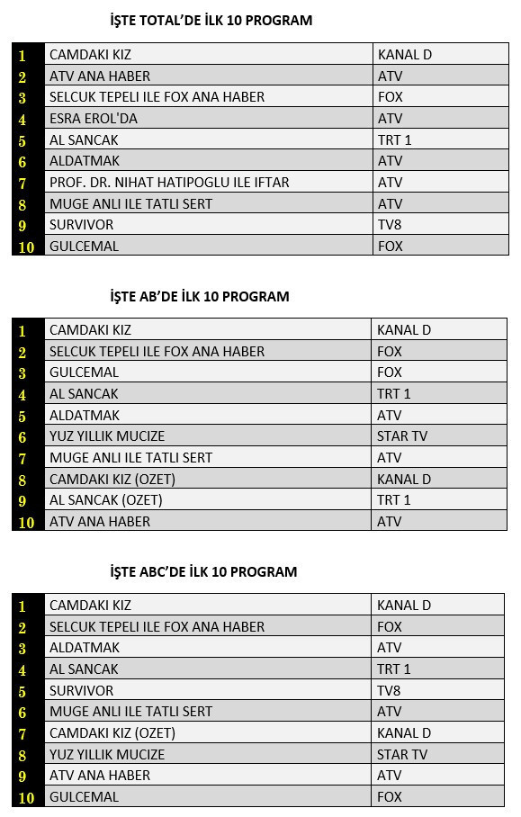 Total'de 1. sırada Kanal D’de yayınlanan “Camdaki Kız”, 2. sırada “Atv Ana Haber”, 3. sırada “Selçuk Tepeli İle Fox Ana Haber”, 10. sırada ise Fox TV’de ilk bölümü ekrana gelen “Gülcemal” yer aldı.