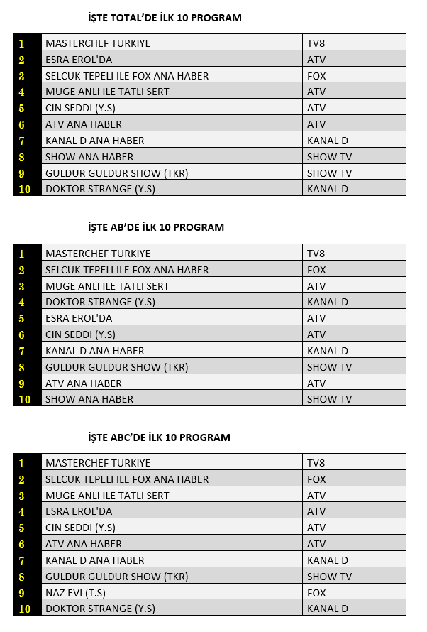 AB'de ise 1. sırada “Masterchef Türkiye”, 2. sırada “Selçuk Tepeli İle Fox Ana Haber” 3. sırada ATV’de yayınlanan “Müge Anlı İle Tatlı Sert” yer aldı.