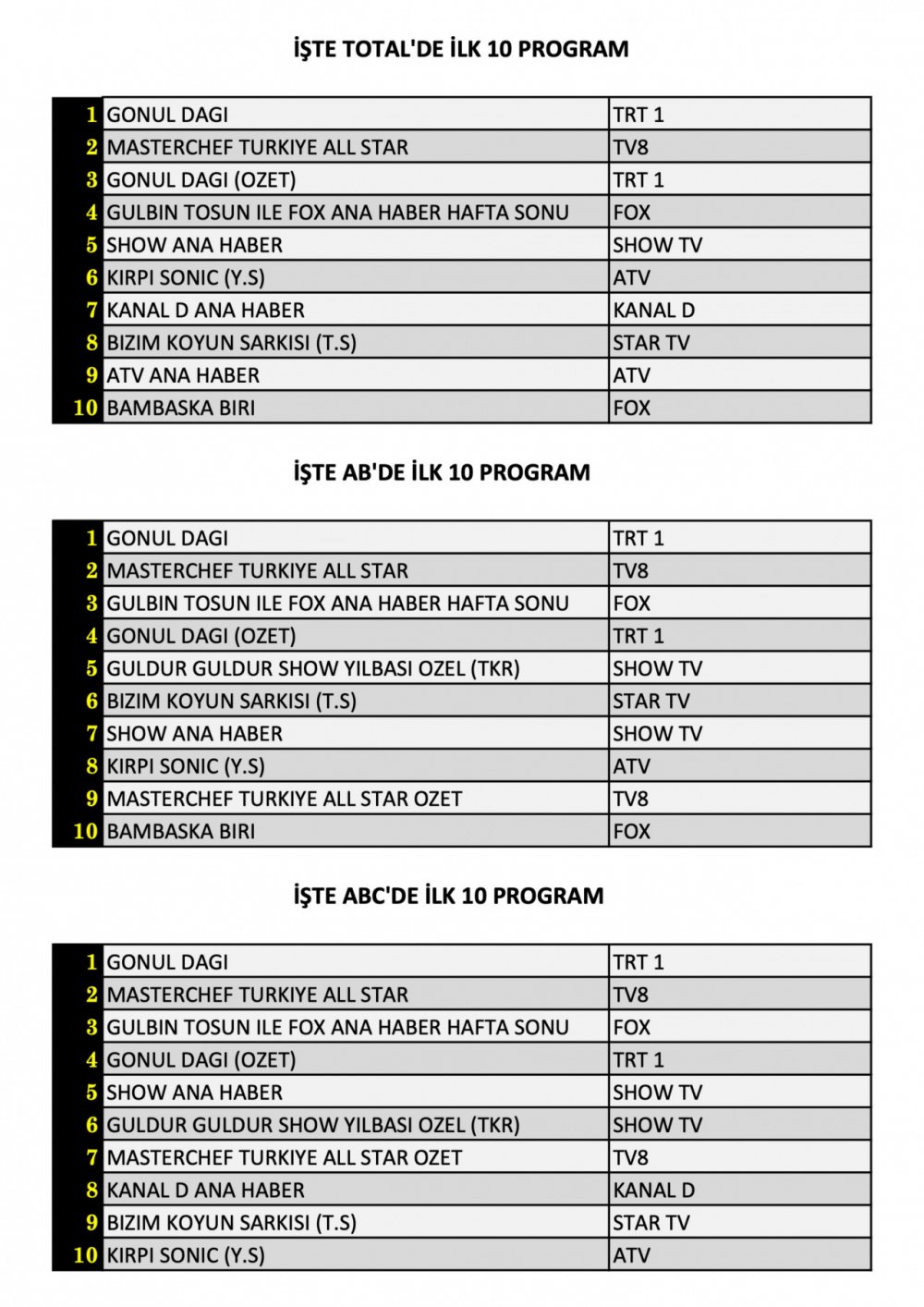 AB’de 1. sırada “Gönül Dağı”, 2. sırada “MasterChef Türkiye All Star”, 3. sırada ise “Gülbin Tosun ile Fox Ana Haber Hafta Sonu” yer aldı.