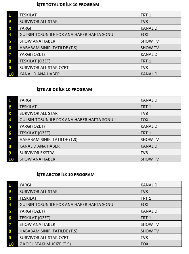 AB'de ise 1.sırada “Yargı”, 2.sırada “Teşkilat” 3.sırada “Survivor All Star” yer aldı.