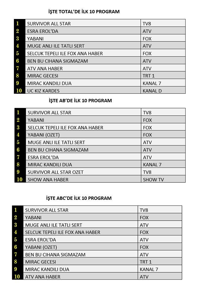 ABC'de ise 1.sırada “Survivor All Star”, 2.sırada “Yabani”, 3.sırada Atv'de yayınlanan “Müge Anlı İle Tatlı Sert” yer aldı.