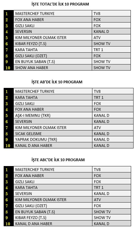 AB'de ise 1. sırada “Masterchef Türkiye”, 2. sırada TRT1’de yayınlanan “Kara Tahta” 3. sırada “Gizli Saklı” yer aldı.