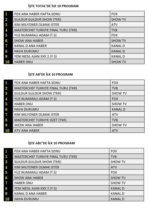 AB'de ise 1.sırada “Fox Ana Haber Hafta Sonu”, 2.sırada TV8’de ekrana gelen “Masterchef Türkiye Final Turu”nun tekrarı, 3.sırada “Güldür Güldür Show”un tekrarı yer aldı.