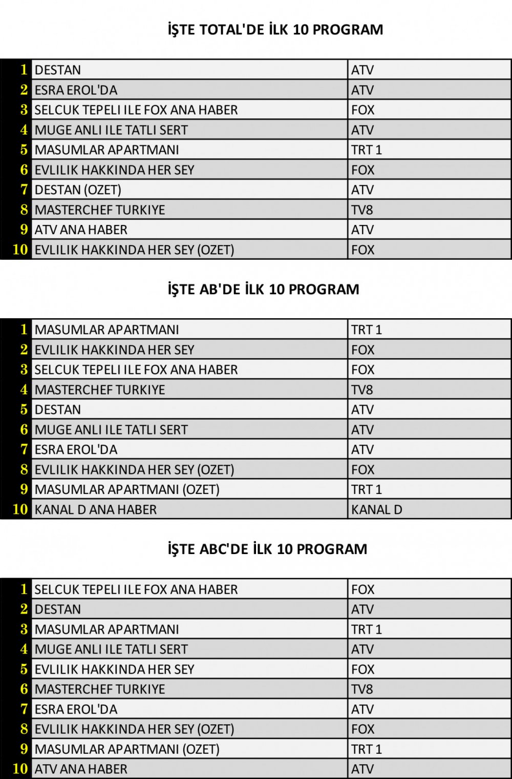 Total’de 1. sırada ATV’de izleyici ile buluşan “Destan”, 2. sırada ATV’de ekrana gelen “Esra Erol’da”, 3. sırada ise Fox’ta yayınlanan “Selçuk Tepeli ile FOX Ana Haber” yer aldı.