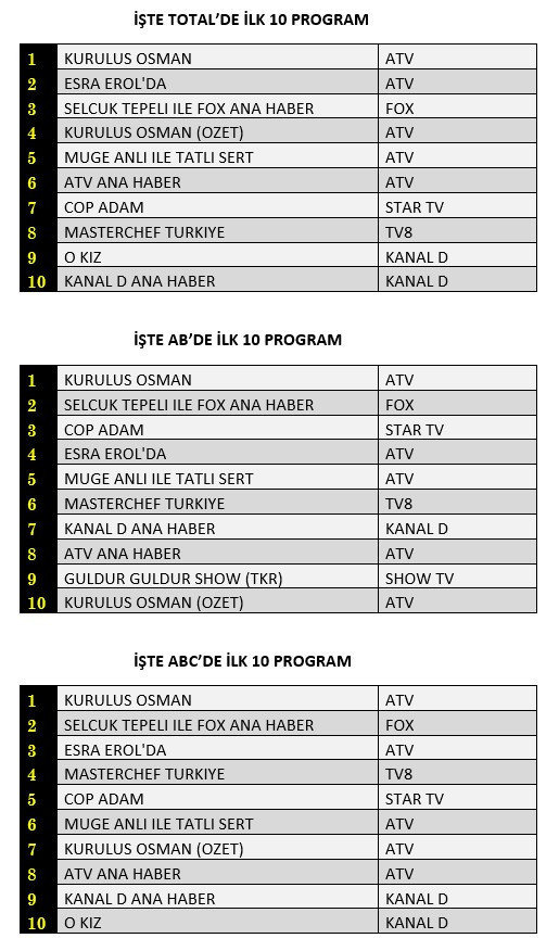 Total'de 1. sırada Atv’de izleyiciyle buluşan “Kuruluş Osman”, 2. sırada Atv’de ekrana gelen “Esra Erol’da”, 3. sırada “Selçuk Tepeli İle Fox Ana Haber” yer aldı.