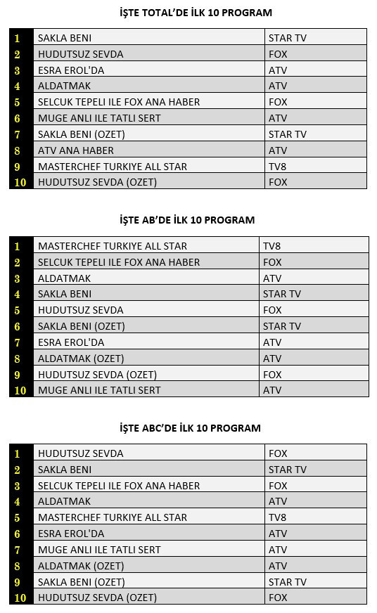 AB'de ise 1. sırada TV8’de ekrana gelen “Masterchef Türkiye All Star”, 2. sırada “Selçuk Tepeli İle Fox Ana Haber”, 3. sırada Atv’de yayınlanan “Aldatmak” yer aldı.