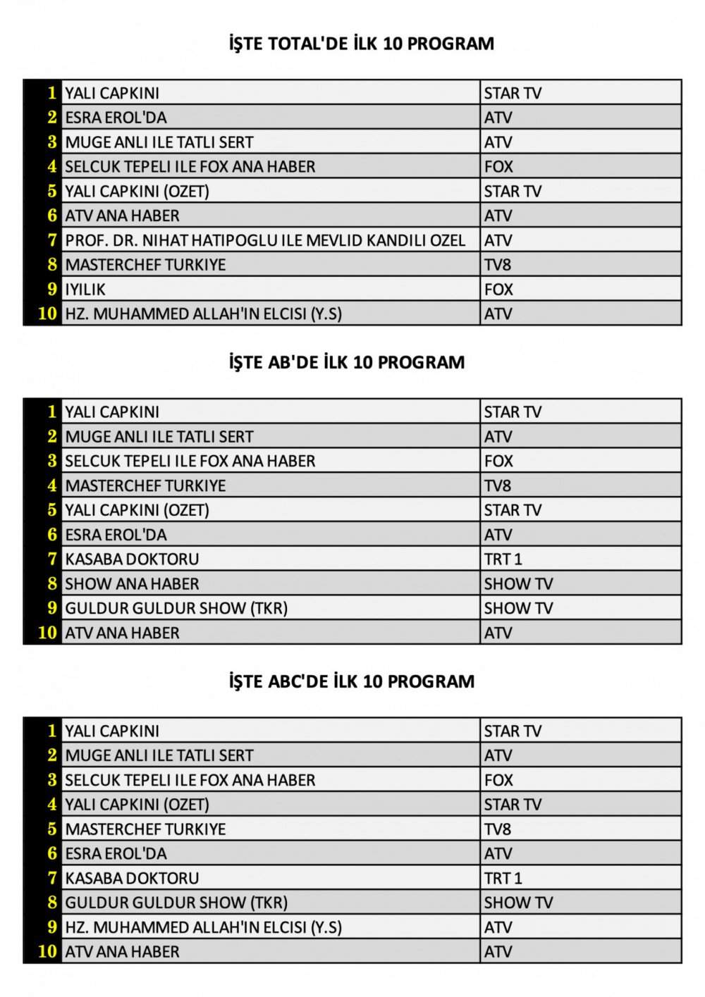 AB’de 1. sırada “Yalı Çapkını”, 2. sırada “Müge Anlı ile Tatlı Sert”, 3. sırada ise “Selçuk Tepeli ile FOX Ana Haber” yer aldı.