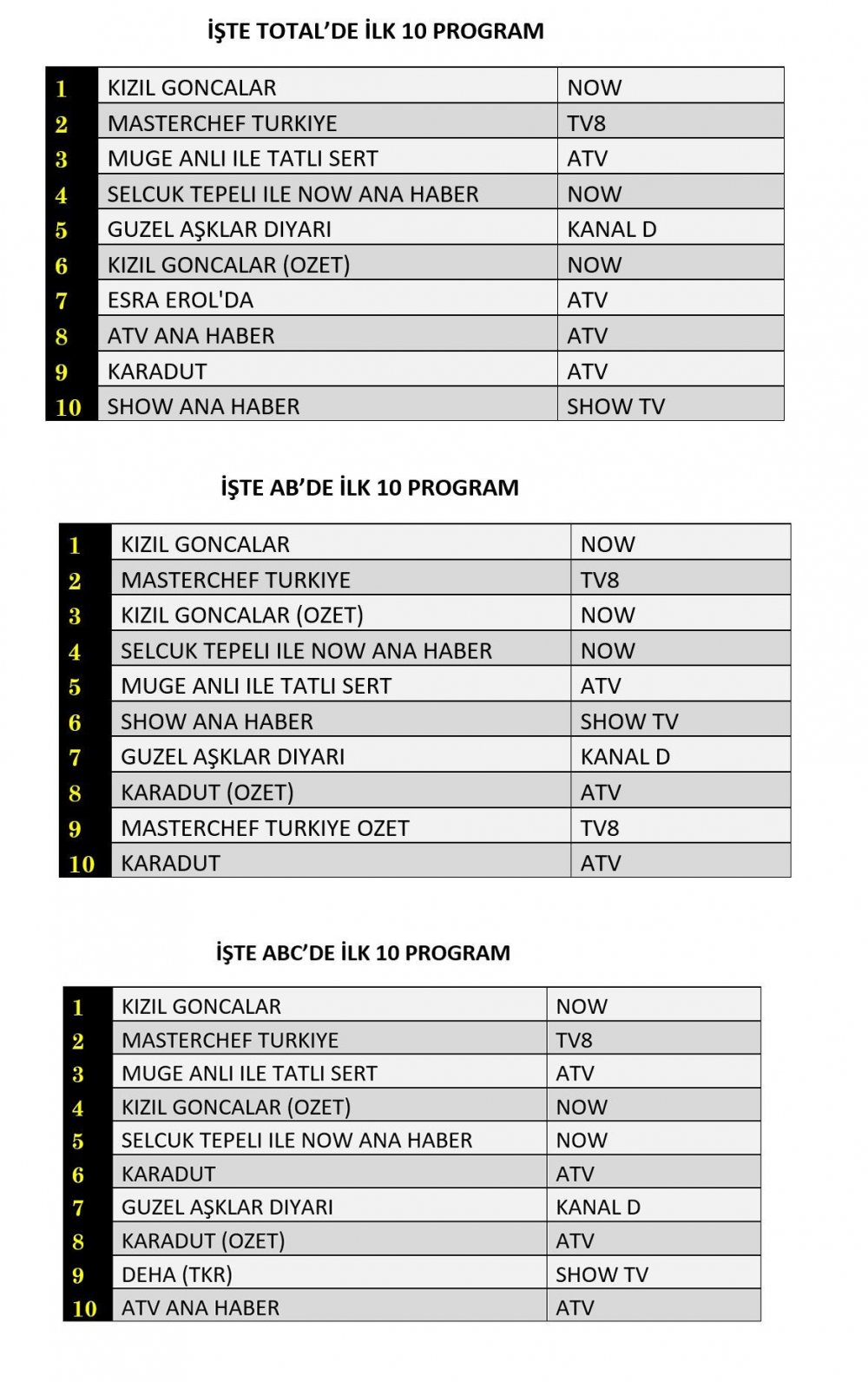 ABC'de ise 1.sırada “Kızıl Goncalar”, 2.sırada “Masterchef Türkiye”, 3.sırada Atv’de ekrana gelen “Müge Anlı İle Tatlı Sert” yer aldı.