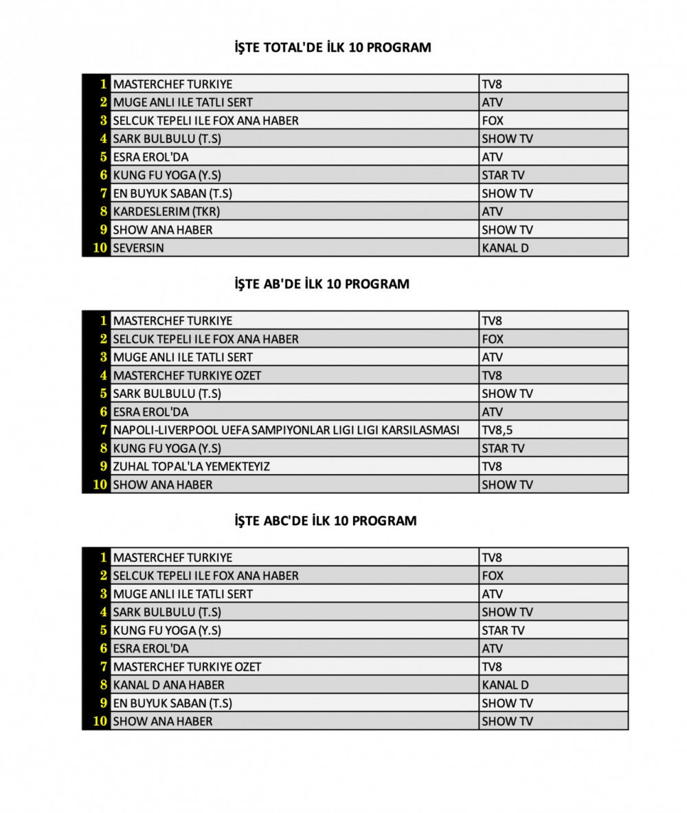 Total’de 1. sırada TV8’de izleyici ile buluşan “MasterChef Türkiye”, 2. sırada ATV’de ekranlara gelen “Müge Anlı ile Tatlı Sert”, 3. sırada ise “Selçuk Tepeli ile FOX Ana Haber” yer aldı.