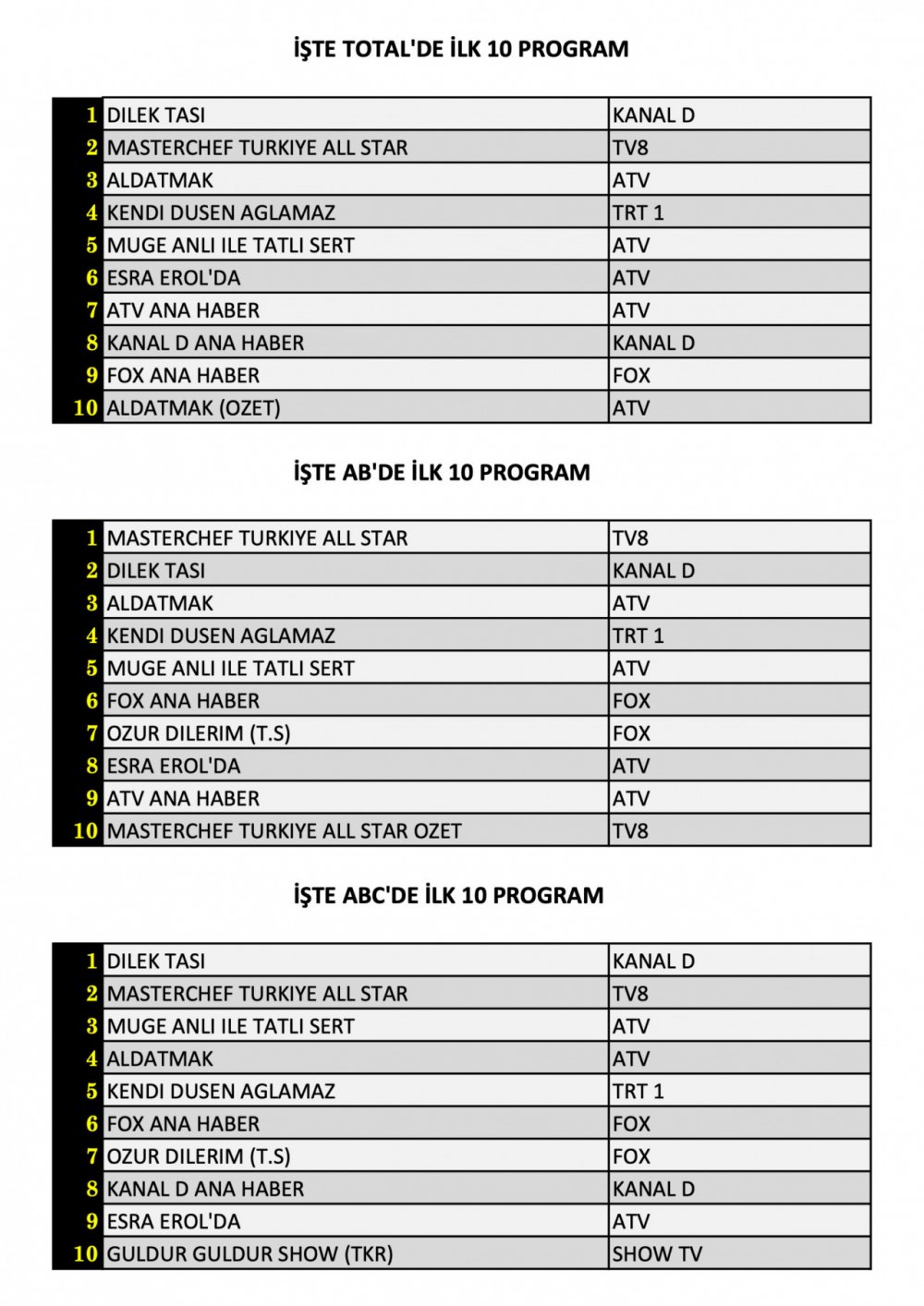 AB’de 1. sırada “MasterChef Türkiye All Star”, 2. sırada “Dilek Taşı”, 3. sırada ise “Aldatmak” yer aldı.